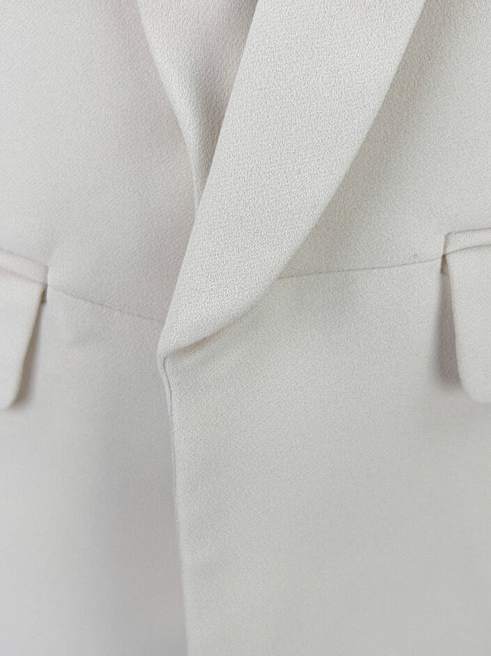 A lapela ampla traz um acabamento refinado e contemporâneo, enquanto as mangas com efeito drapeado adicionam modernidade e um toque descomplicado à alfaiataria clássica.