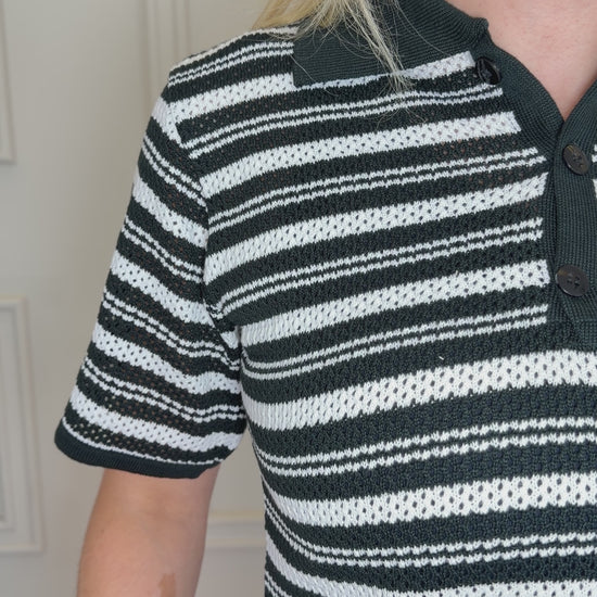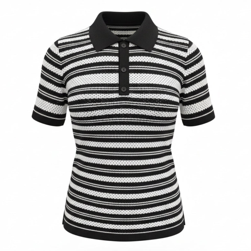 A modelagem reta garante um caimento confortável, enquanto a gola polo com decote sutil adiciona um charme urbano e atual à peça. As listras em tons neutros tornam a blusa fácil de combinar, transitando com naturalidade entre produções casuais e looks mais arrumados.