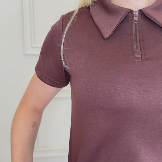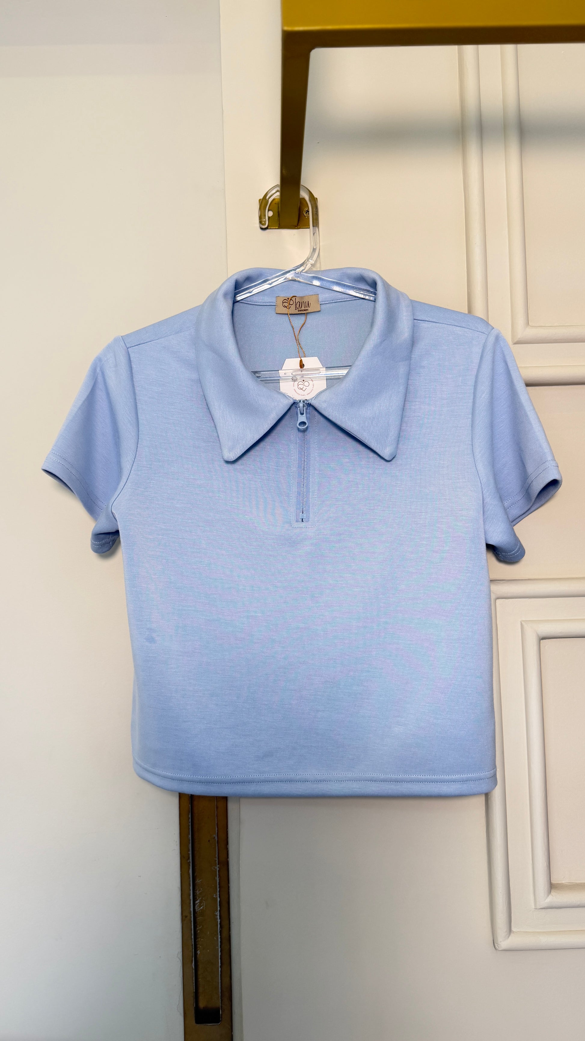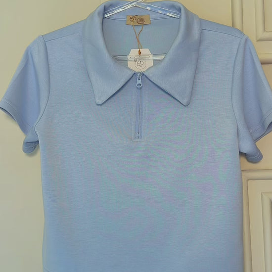 A gola polo com zíper frontal adiciona um detalhe contemporâneo à peça, permitindo diferentes formas de uso — mais fechada para um visual alinhado ou levemente aberta para uma proposta casual. A modelagem reta garante conforto e versatilidade, facilitando combinações com calças, shorts ou saias.