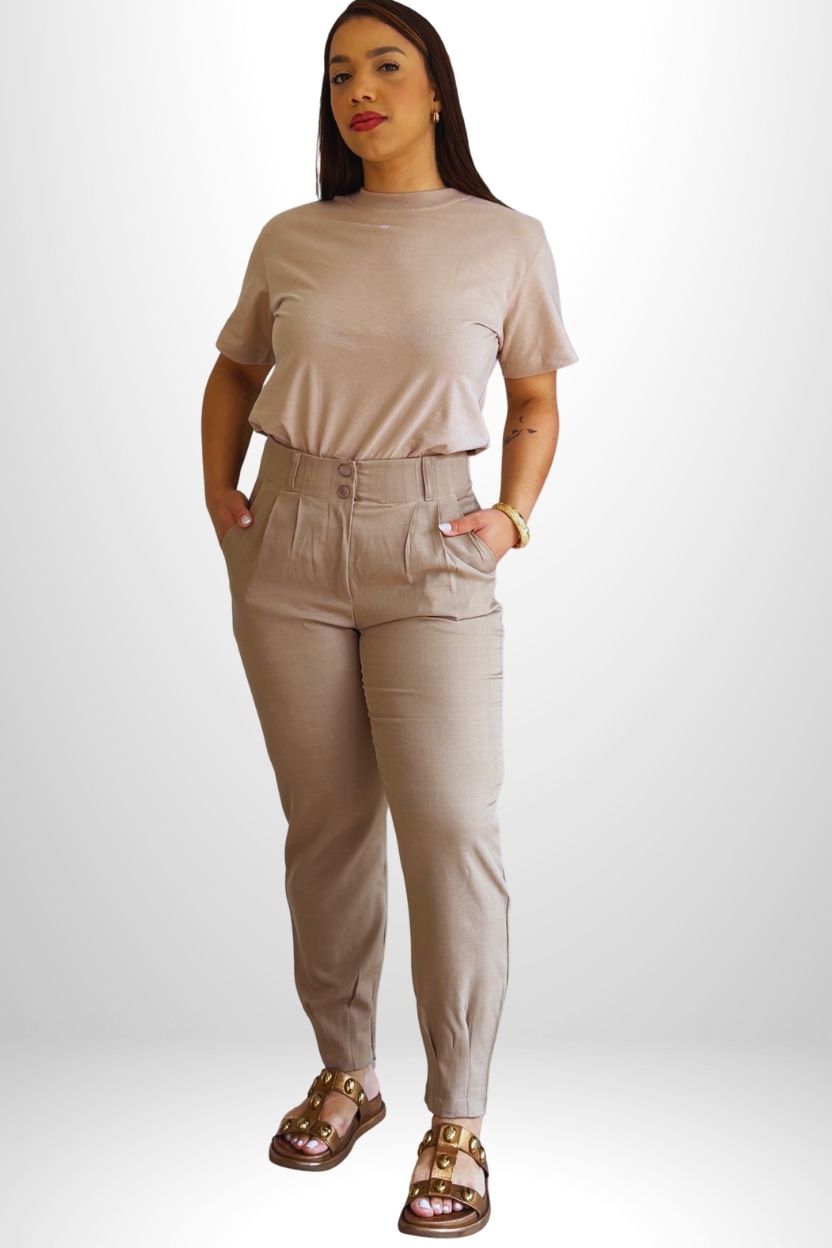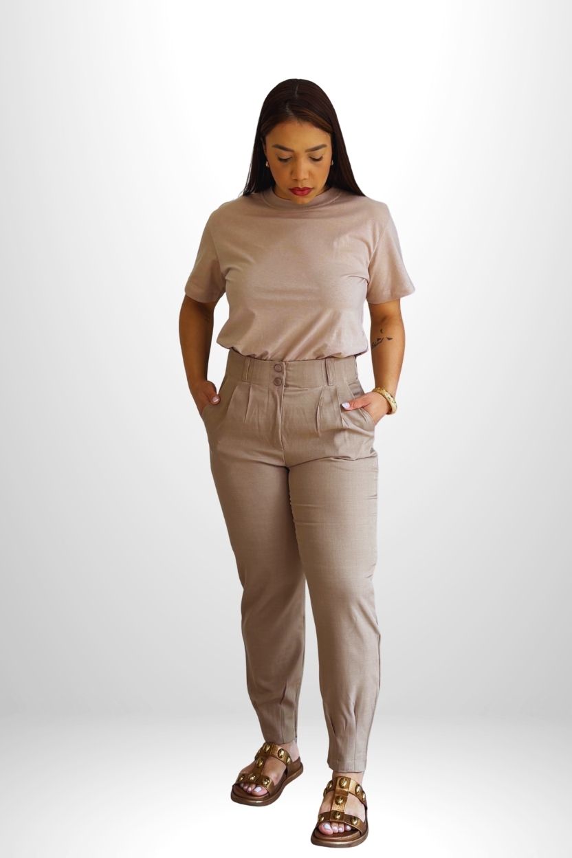 equilíbrio ideal entre conforto e sofisticação. Confeccionada em tecido de alfaiataria premium com leve elasticidade, oferece caimento impecável, cintura alta e modelagem que valoriza a silhueta sem perder o conforto.
