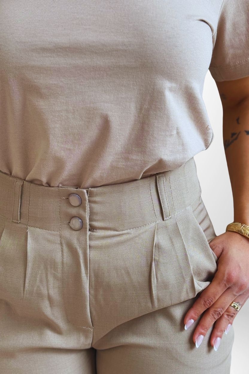 Com detalhes como pregas frontais sutis, bolsos laterais funcionais e fechamento com botão encapado, a peça traz um toque moderno e elegante — perfeita para looks de trabalho, jantares ou produções casuais com estilo.