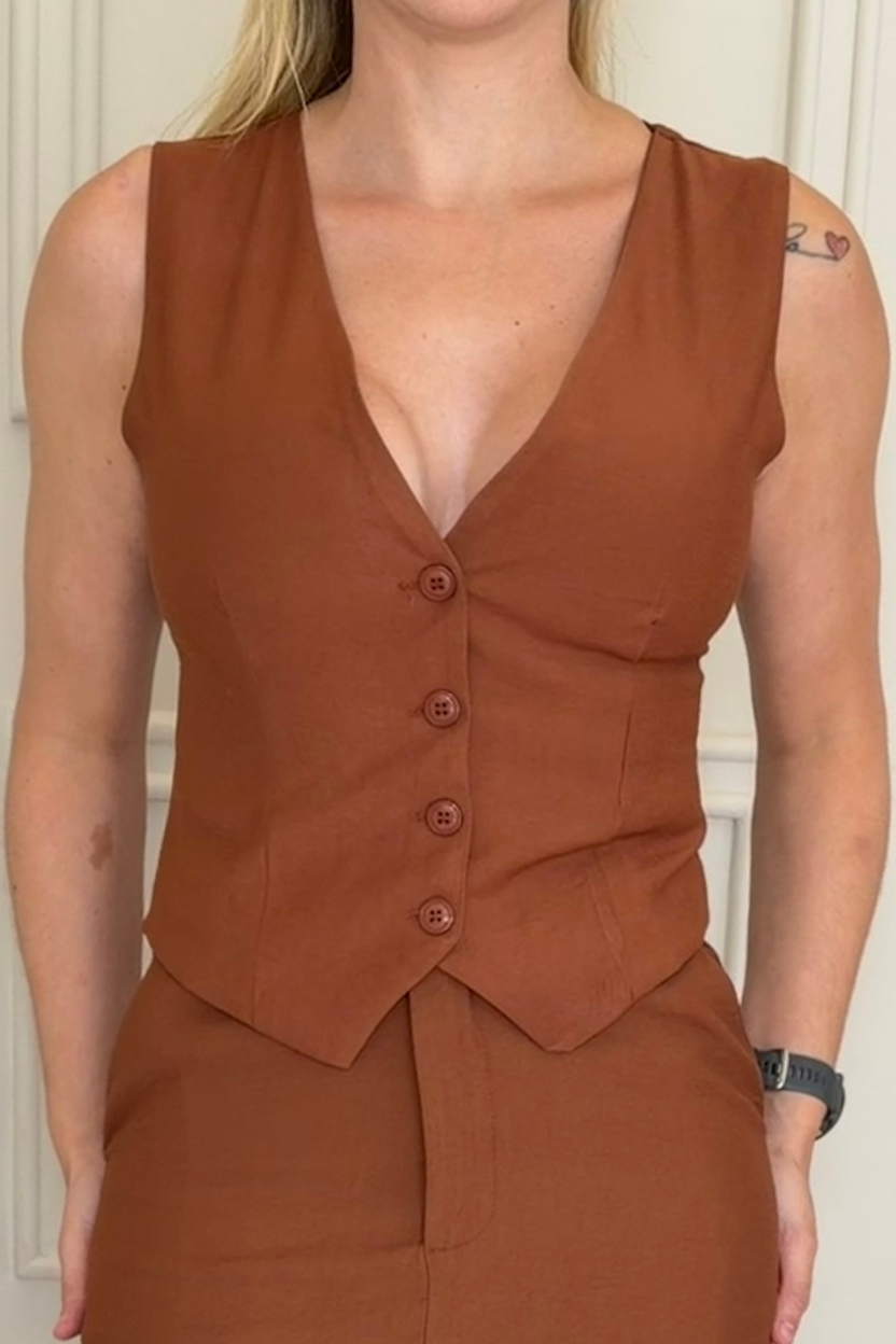 Sofisticado e moderno, este colete de alfaiataria é uma peça-chave para composições elegantes e atuais. Com modelagem estruturada e decote em V, ele valoriza a silhueta e traz um visual refinado, perfeito para produções que transitam do office chic ao casual elegante.
