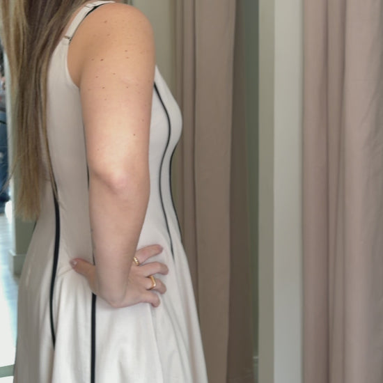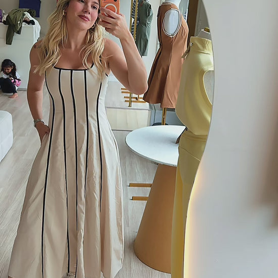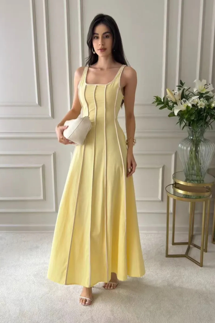 Confeccionado em tecido estruturado de toque leve, o modelo possui decote quadrado e alças médias, equilibrando feminilidade e refinamento. Seu caimento impecável o torna ideal para ocasiões especiais, jantares ou eventos elegantes.